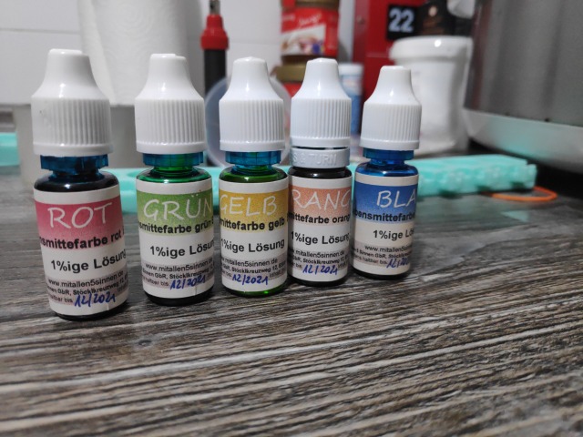 - Verschiedene flüssige Lebensmittelfarben, sehr konzentriert, man benötigt nur wenig.