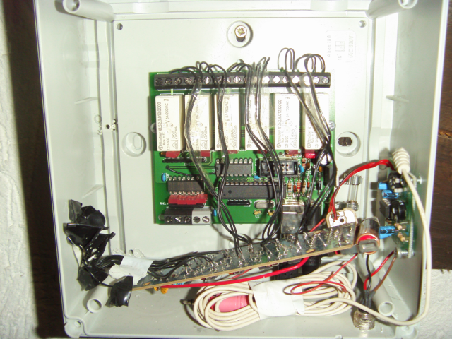 For the socket control i used a simple package from Pollin again, u can use any kind of remote socket package. I used one that came with at least 3 sockets that can be coded with 4^2 variants. As you can see at the picture, i opened the remote control and soldered its tip switches to the wires that are connected with the relais pins. The little thingie on the right is a mono-microphone-amplifier for voice control. Im not using it because the 9V battery for this is empty after 2 days of use :). Besides, the voice control works pretty fine if you get a bit deeper into the Microsoft Speech SDK.